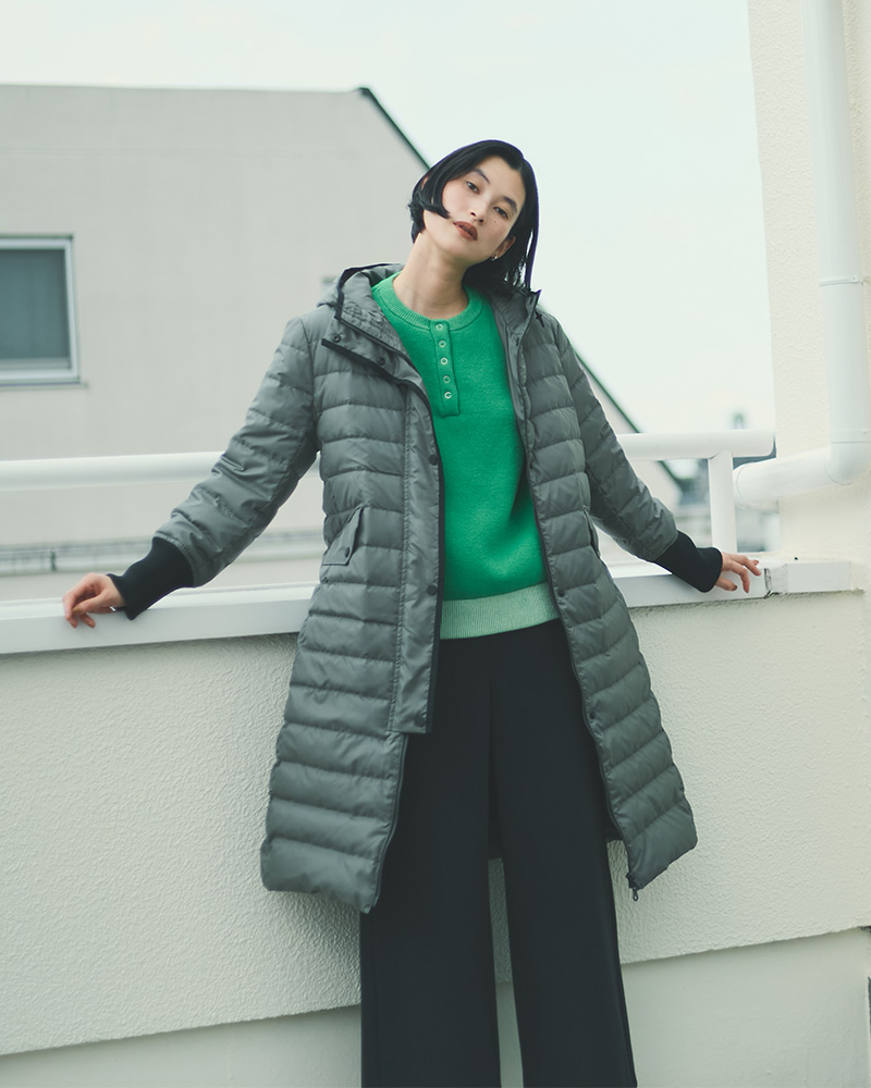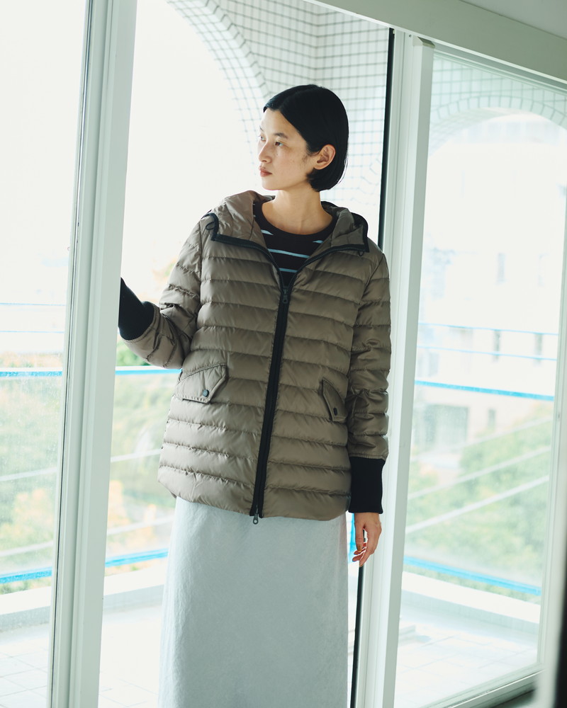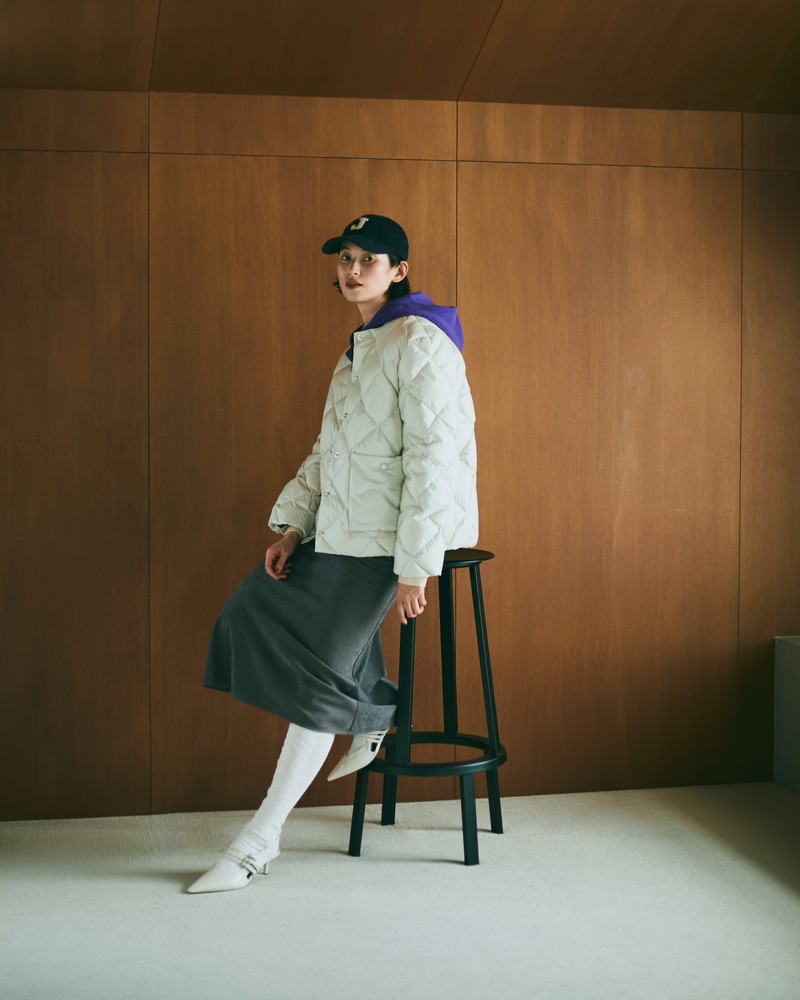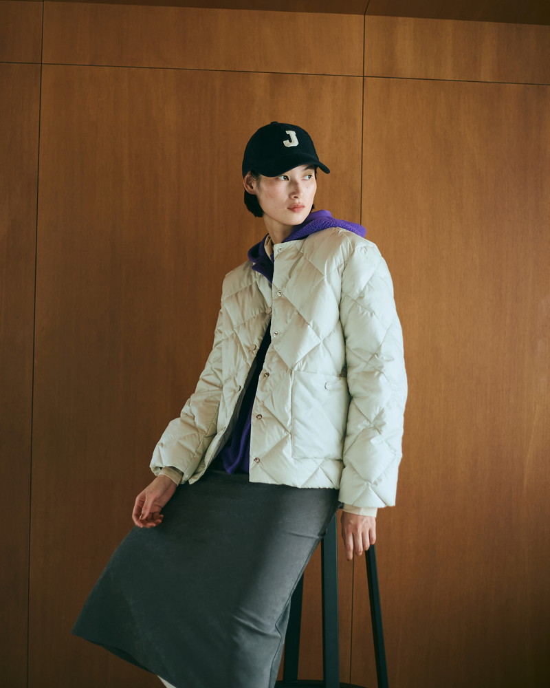 これまで紹介の2型とはガラリと印象が異なる「軽量ダウンジャケット」。大きめのスクエアキルトが、スタイリングにモダンな表情を演出。フロントのスナップボタンがさりげないアクセントを添えます。