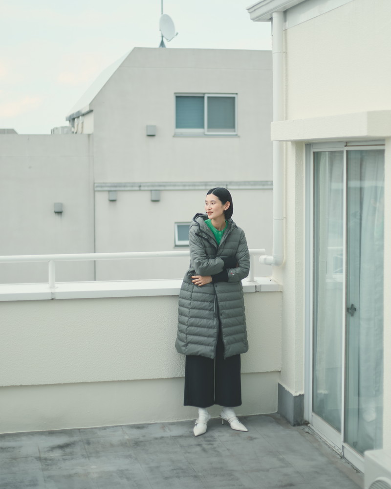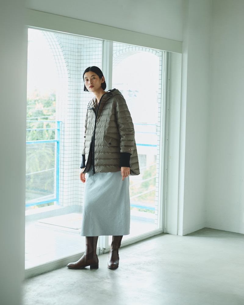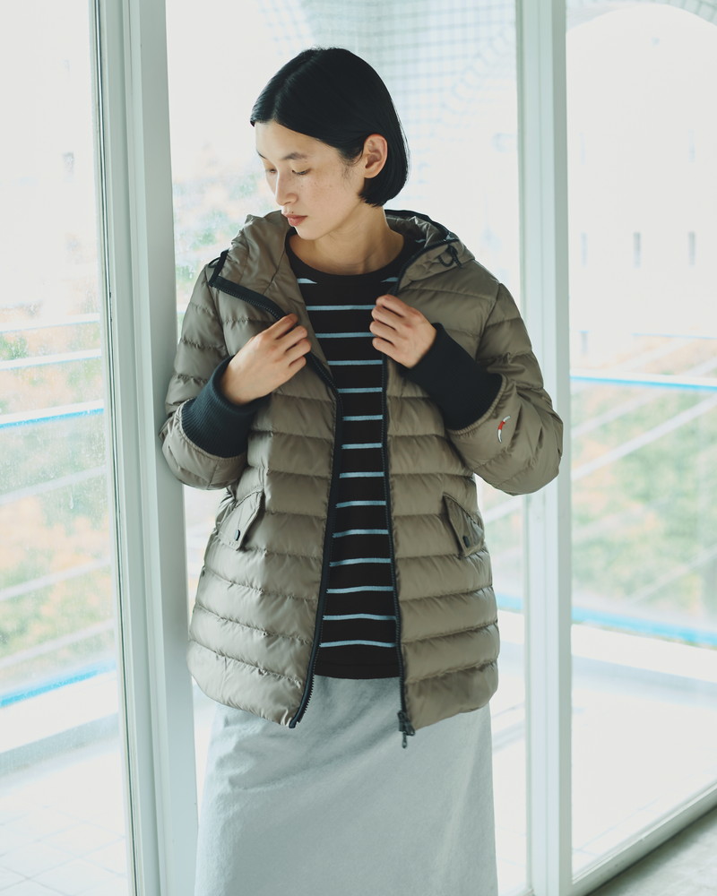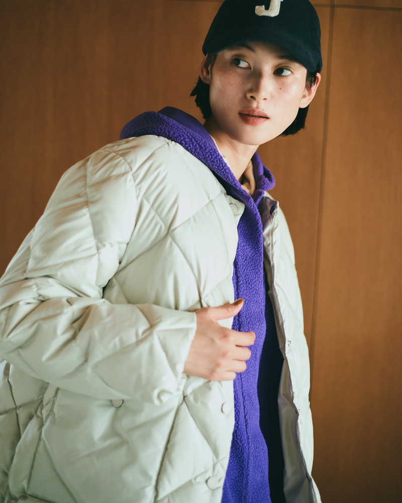 これまで紹介の2型とはガラリと印象が異なる「軽量ダウンジャケット」。大きめのスクエアキルトが、スタイリングにモダンな表情を演出。フロントのスナップボタンがさりげないアクセントを添えます。