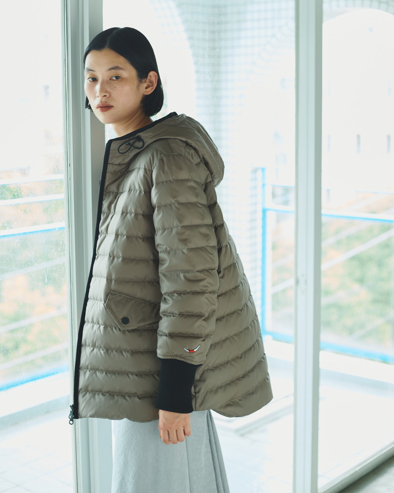 こちらも表地は撥水加工、裏地は静電気が起きにくい素材を使用。キルティング内の羽毛には、河田フェザーのグリーンダウンを使用しています。