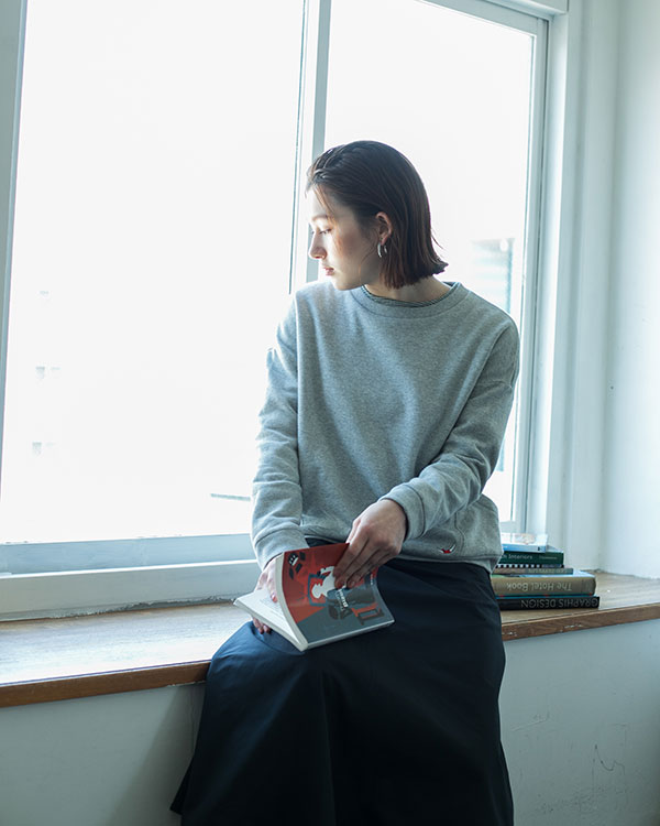 プルオーバーはドロップショルダーのゆったりシルエット。 裾のダイビングガールの刺繍もポイント。